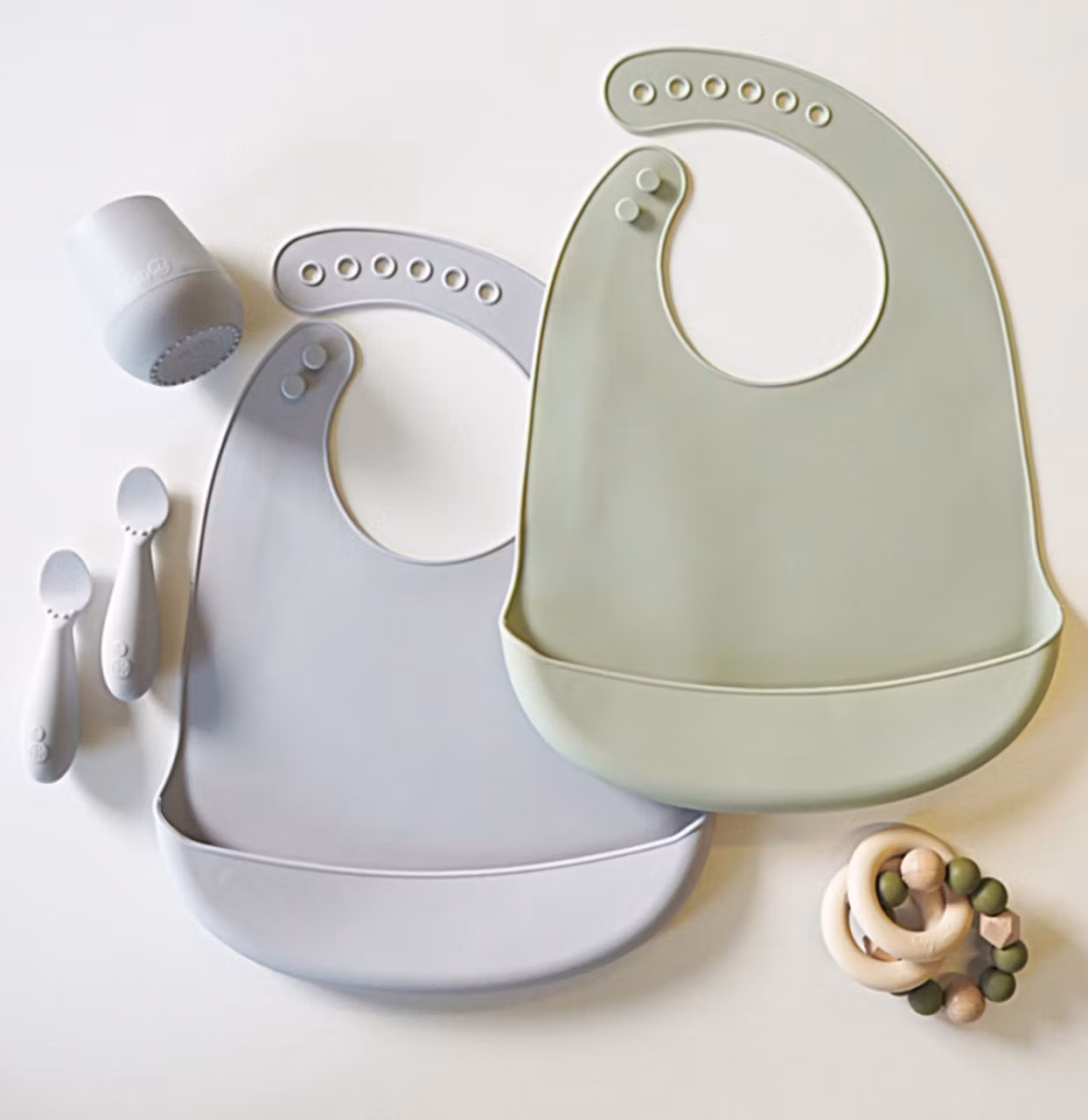 Den är tillverkad av 100% icke-irriterande silikon för barnets känsliga hud och är supermjuk för barnet att bära. Haklappen har en ficka för att fånga upp matspill och den är lätt att rengöra med handtvätt eller i diskmaskin. Med ett justerbart spänne kan du anpassa haklappen för att passa din bebis perfekt.