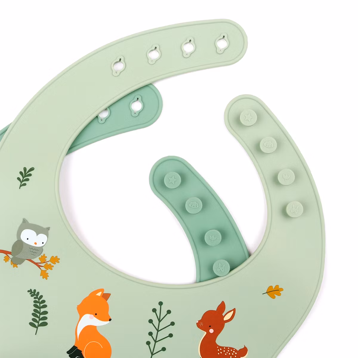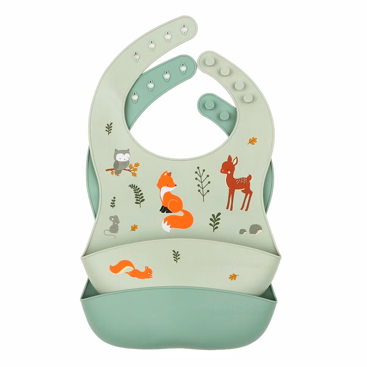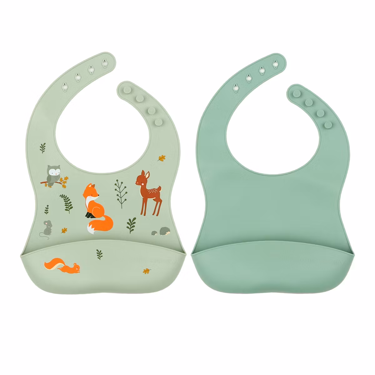 Vackra haklappar i 2-pack från A Little Lovely Company. En är prydd med skogens djur och den andra är matchande enfärgad i en härlig och genusfri grön färg.