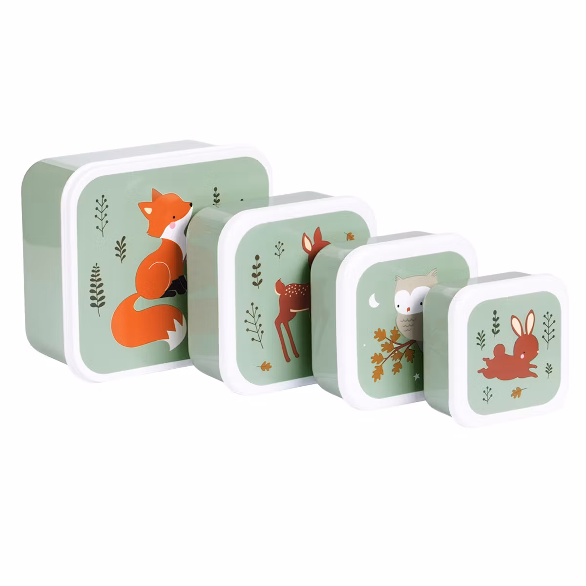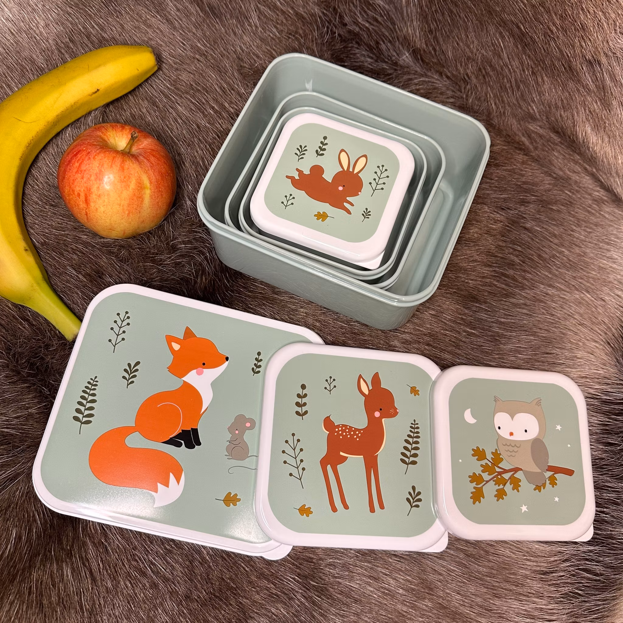 Ett set med fyra boxar i olika storlekar för lunch eller snacks. A Little Lovely Company matlådeset har en fyrkantig form och innehåller fyra olika storlekar. Lådorna är härligt gröna och locken har olika motiv av skogens djur. Locket är avtagbart och matlådorna kan enkelt staplas.