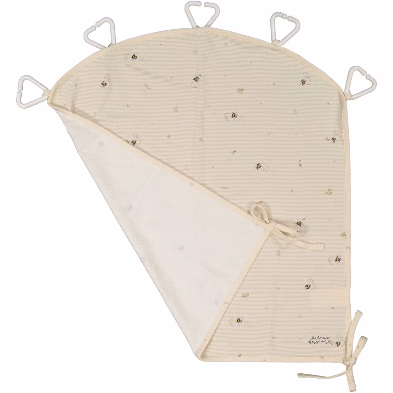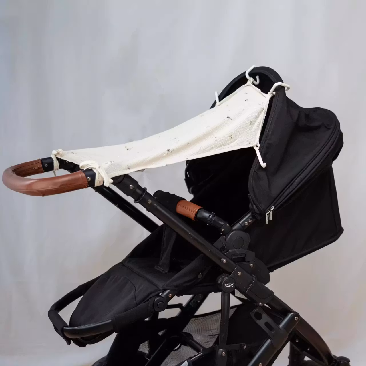 Tillverkad i ett material med UV50+ som blockerar 98% av solens UVA- och UVB-strålar. Materialet andas och ger bra luftcirkulation. Passar de flesta barnvagnar, bilstolar och mer. Fästs enkelt med de medföljande plastringarna.