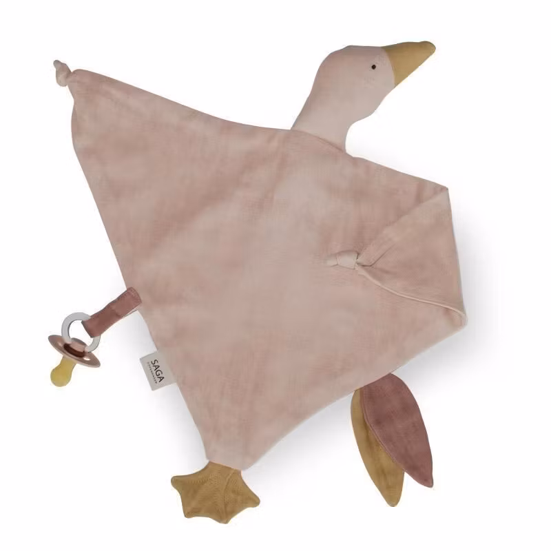 Mjuk Snuttefilt i form av en gås av 100% ekologisk bomull ger trygghet och tröst. Perfekt för nyfödda, med praktisk napphållare. Hållbar och säker för ditt barn