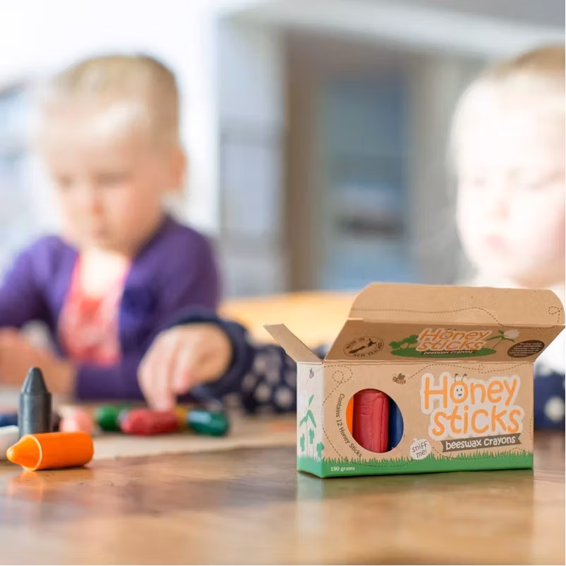 12-pack giftfria Honeysticks bivaxkritor. Tjocka kritor, lätta att hålla för barn. Livsmedelsgodkända pigment & plastfria.