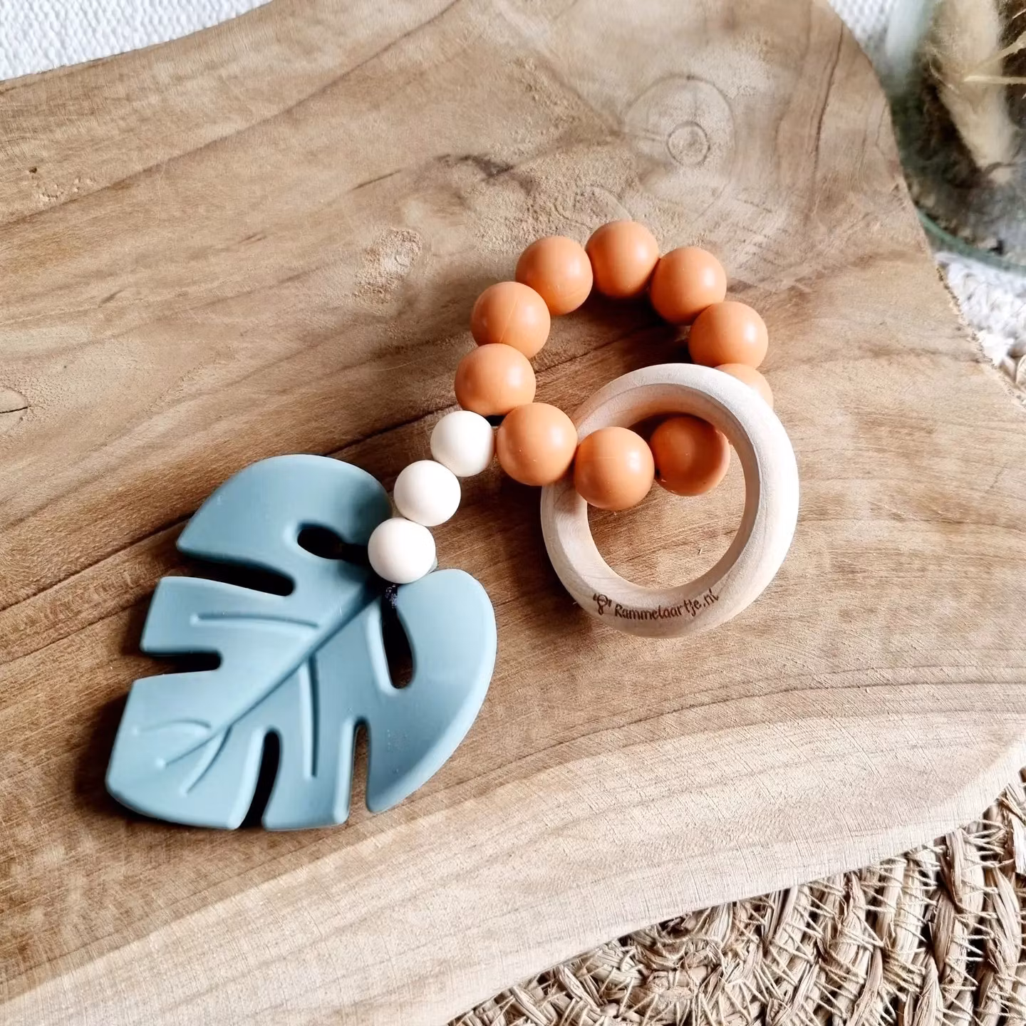 Handgjord tandring av silikonpärlor & träring. Lindrar tandsprickningssmärta & är lätt att greppa. Säker babyskallra.