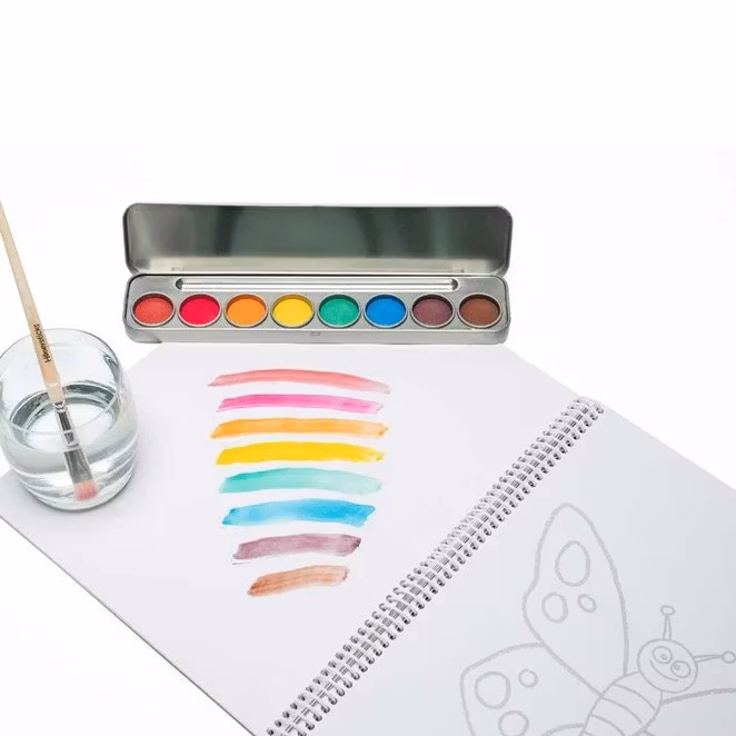 Ett perfekt val för föräldrar som söker säkra och tvättbara färger för sina barn. Akvarellerna levereras i en återanvändbar metallburk och inkluderar en naturlig pensel i trä. Använd dem för allt från målarböcker till fritt skapande!