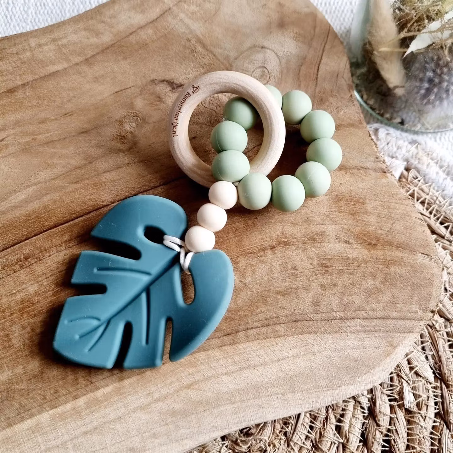 Handgjord tandring av silikonpärlor & träring. Lindrar tandsprickningssmärta & är lätt att greppa. Säker babyskallra.