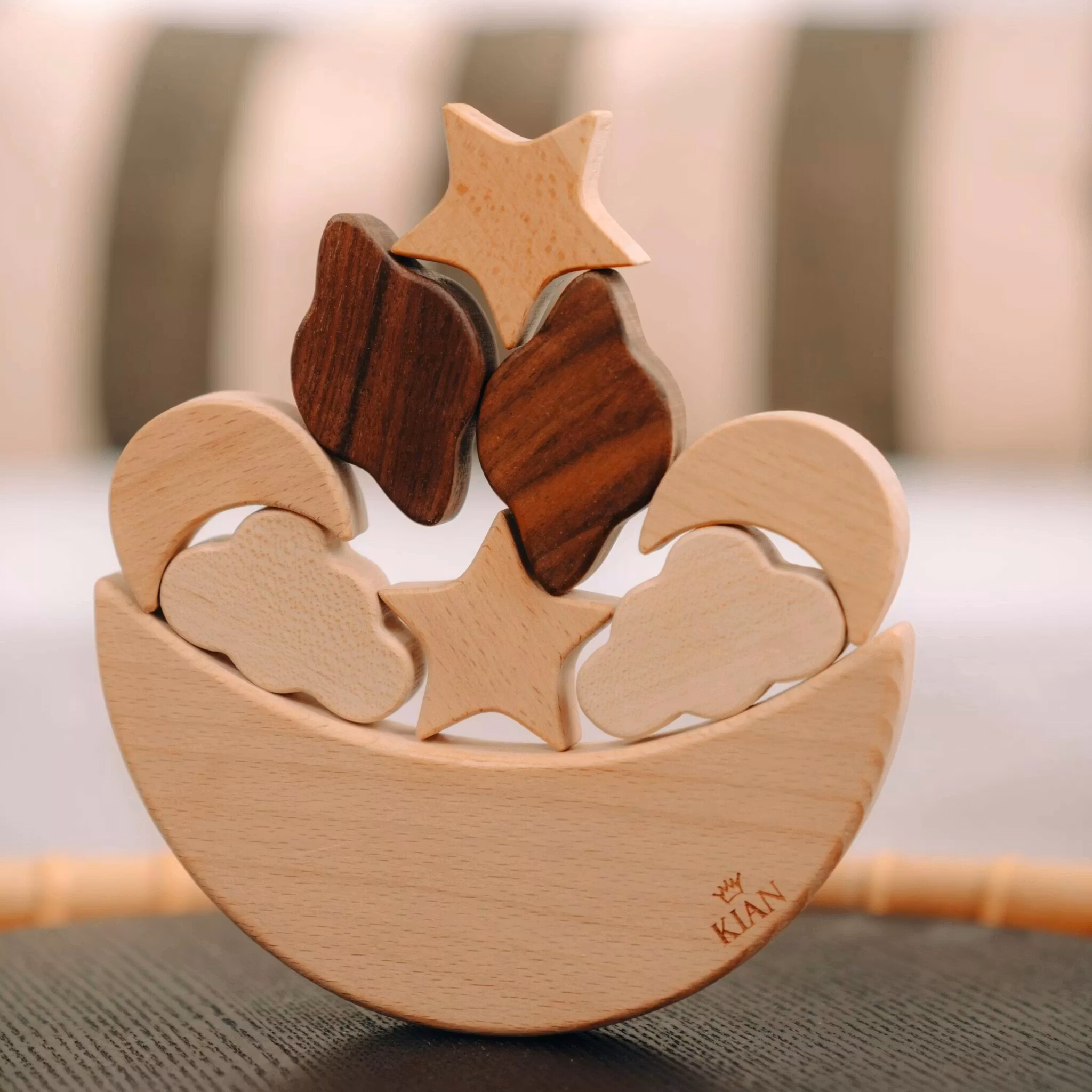Balancing Moon är ett pedagogiskt balansspel i högkvalitativt trä för barn från cirka 3 år. Den halvmåneformade basen och de 8 medföljande träfigurerna (stjärnor och moln) inbjuder till koncentrerad lek och motorisk träning.