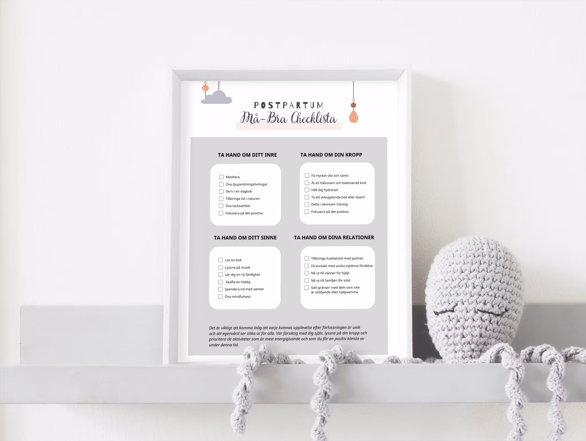 Ladda ner vår Postpartum Checklista gratis för att kolla av så att du tar hand om allt från ditt inre mående till ditt fysiska välbefinnande.